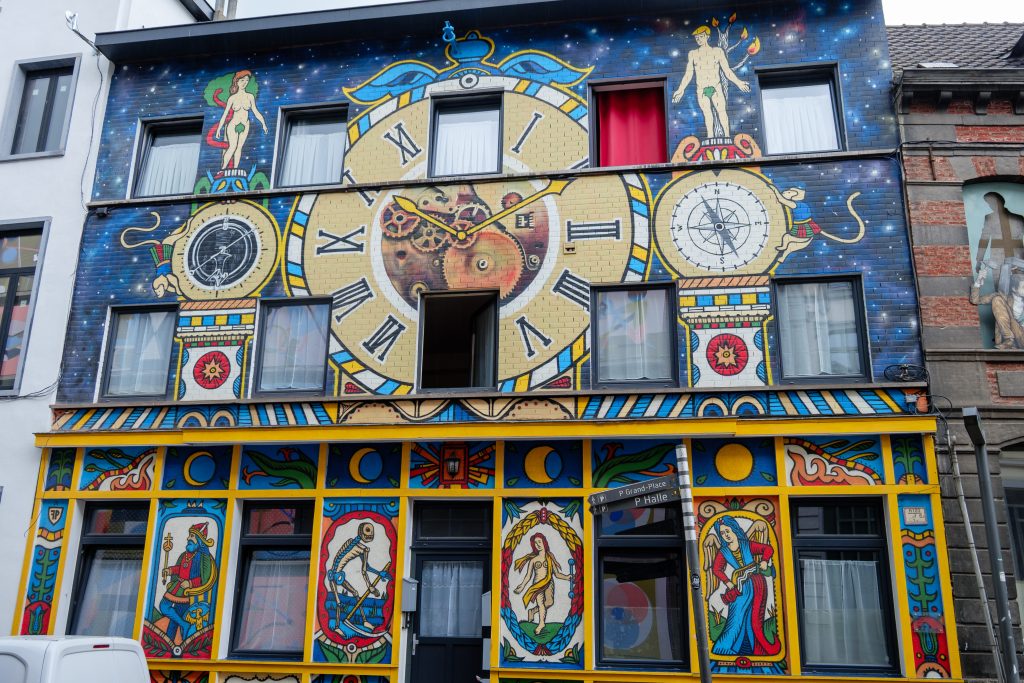 Recht tegenover de kerk zagen we een kleurrijk geschilderde gevel achter een poortgebouw. We kwamen terecht in een gezellige tuin waarin fitnesstoestellen stonden. Het bleek Jardin Gustave Jacobs te zijn (een beeldhouwer uit Bergen wiens werken in het stadhuis te bewonderen zijn).