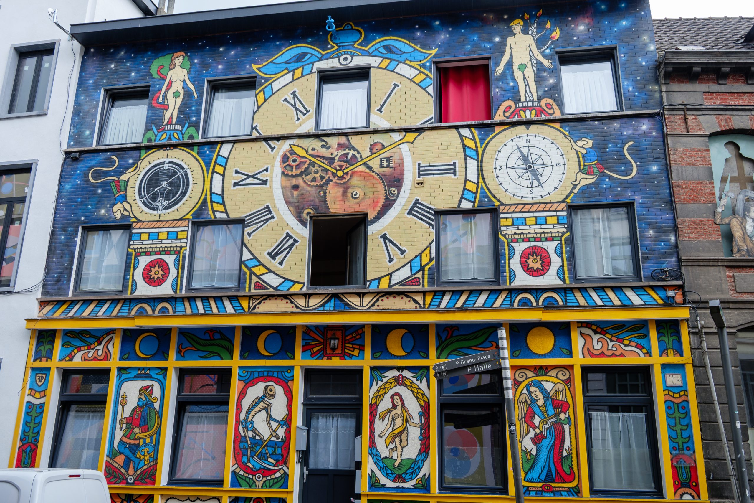 Een Brusselse kunstenaarscollectief met uiteenlopende talenten, van videografie tot grafisch ontwerp. Hun gevelkunst symboliseert boven het hemelse met Adam en Eva, en beneden vier figuren in de nissen: The Emperor, La Mort, Le Monde en La Tempérance.