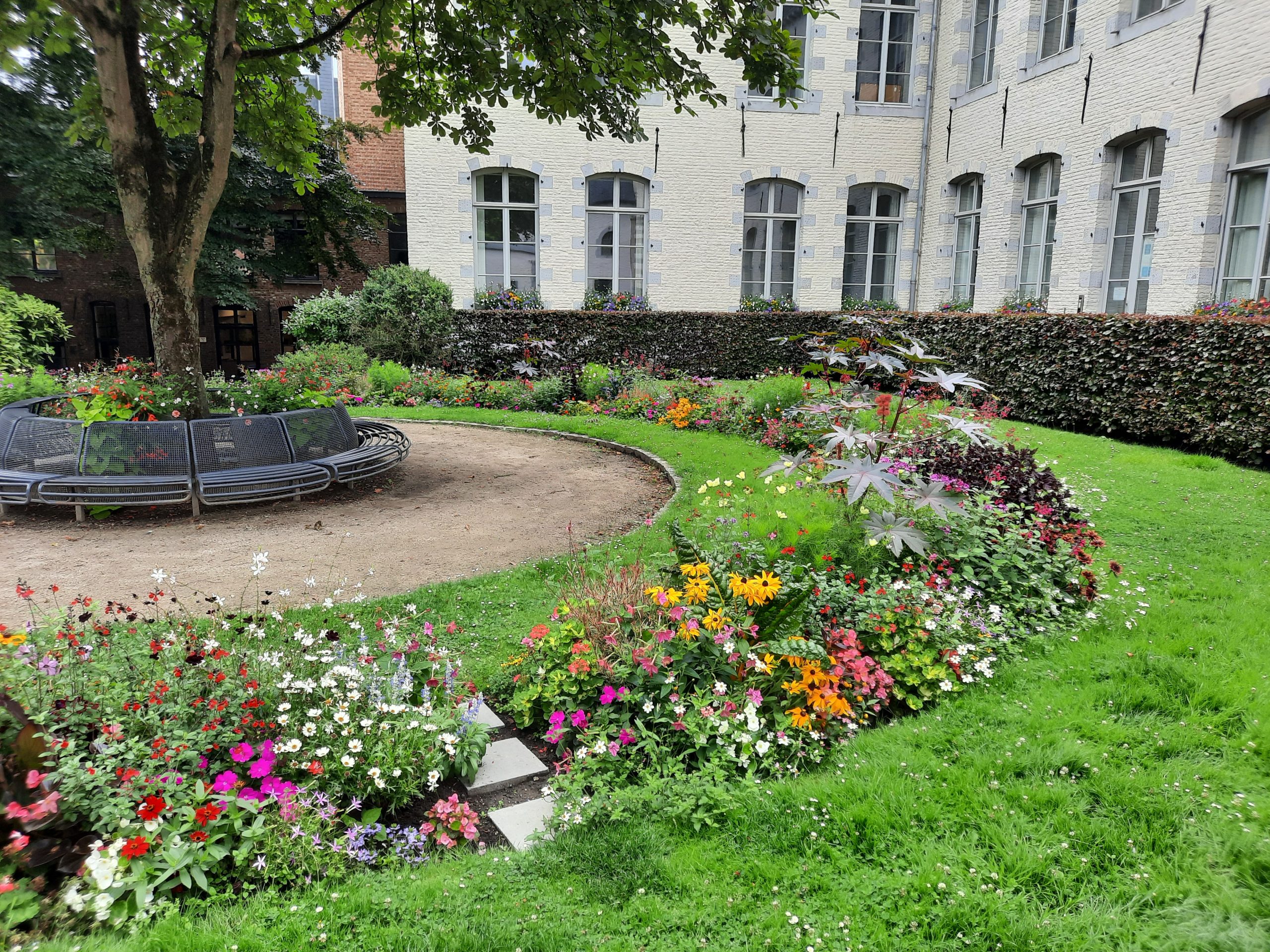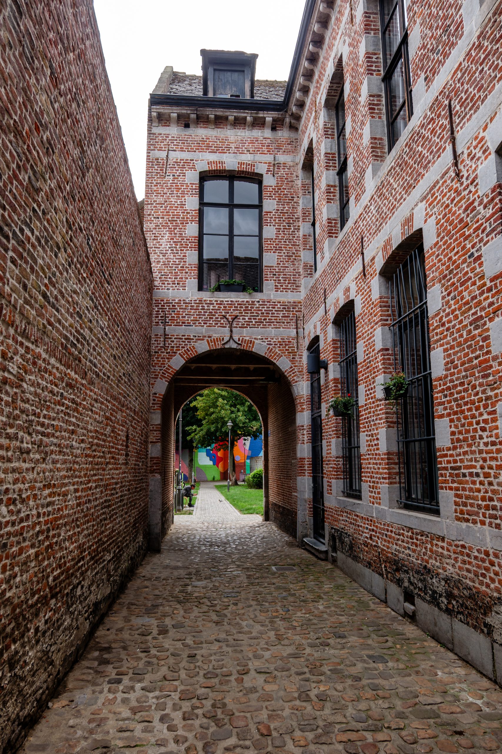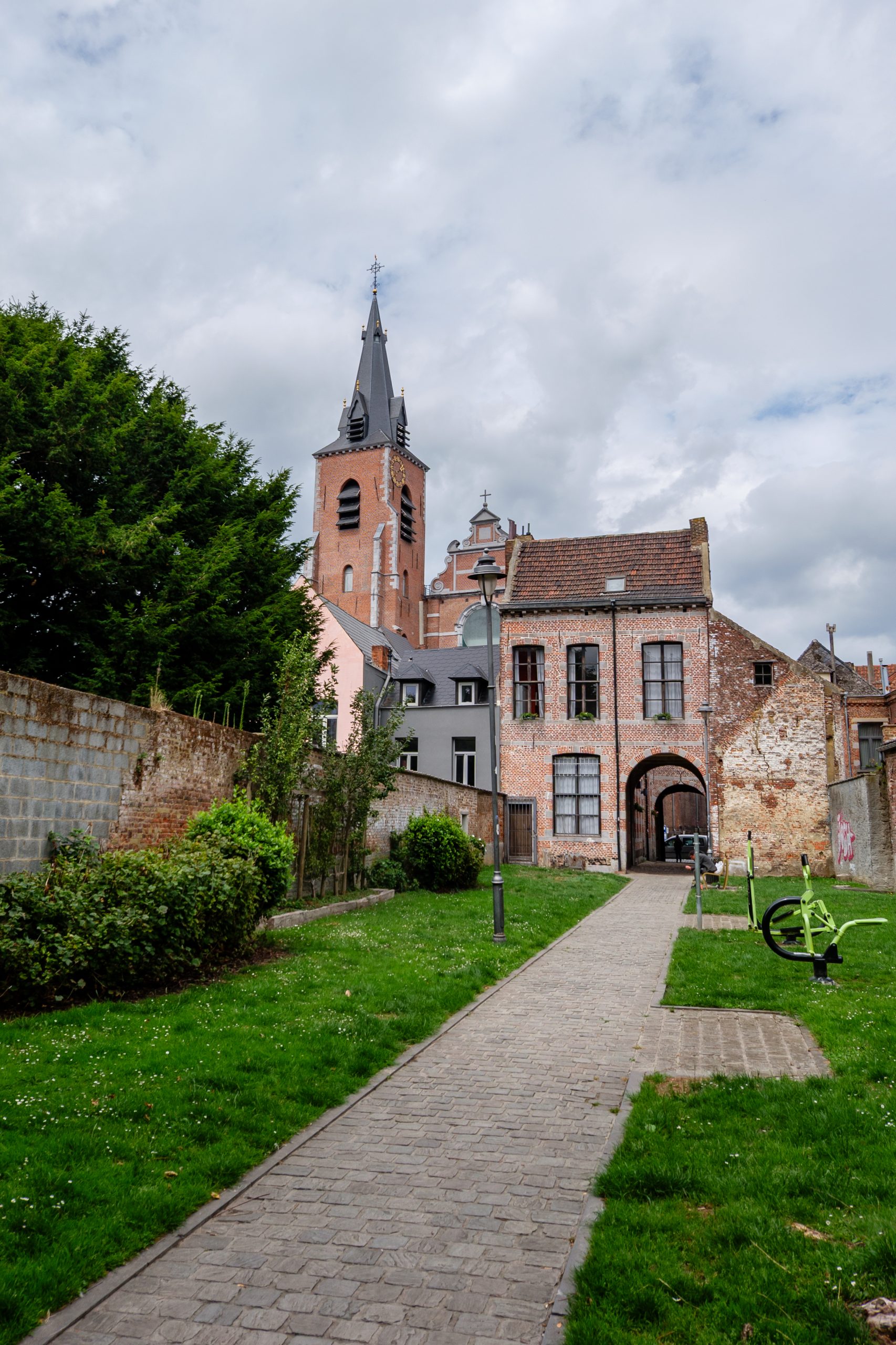 Recht tegenover de kerk zagen we een kleurrijk geschilderde gevel achter een poortgebouw. We kwamen terecht in een gezellige tuin waarin fitnesstoestellen stonden. Het bleek Jardin Gustave Jacobs te zijn (een beeldhouwer uit Bergen wiens werken in het stadhuis te bewonderen zijn).
