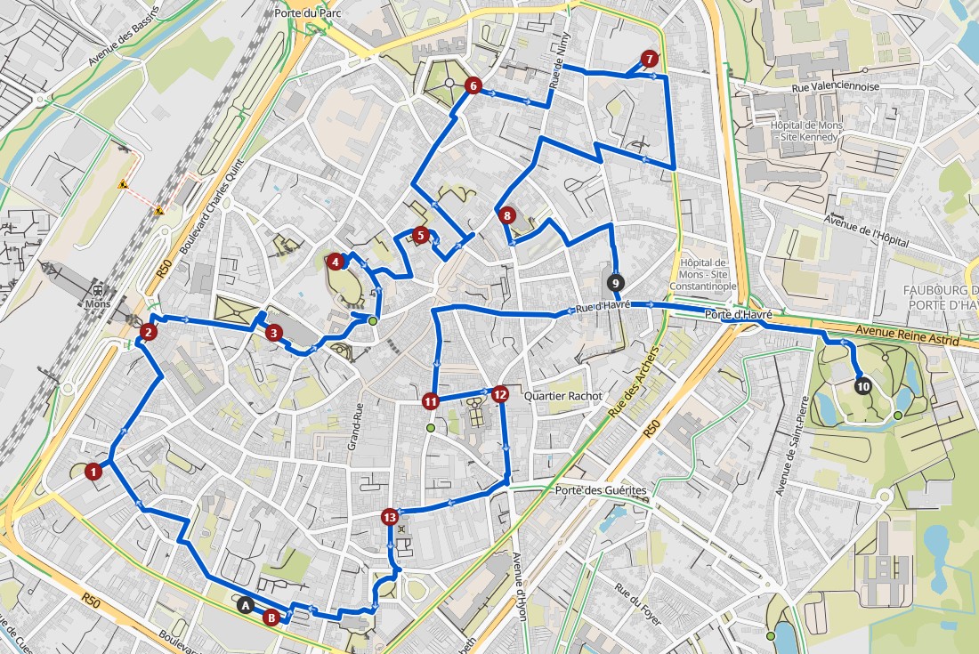 We parkeerden op Place Nervienne. Het was er om 10u al behoorlijk druk, we moesten twee keer rondrijden om een vrij plekje te vinden – maar, wie zoekt, die vindt! Rond 10u15 begon onze ontdekkingstocht, gebaseerd op een eigen samengestelde Komoot-wandeling. Ik had er zelfs een gidsje bijgemaakt: een zorgvuldig geprint Word-document met weetjes en uitleg. Toeristisch voorbereid, dat waren we zeker.